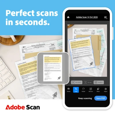 Преобразувайте вашето устройство в мощен скенер с Adobe Scan AI PDF Scanner, OCR. Получавайте идеално прави и професионални сканирания всеки път, с автоматично изправяне на страници. Създавайте и организирайте PDF файлове и JPEG изображения лесно. Използвайте AI Асистента за бързо извличане на ключови данни. Вашият джобен скенер за документи.