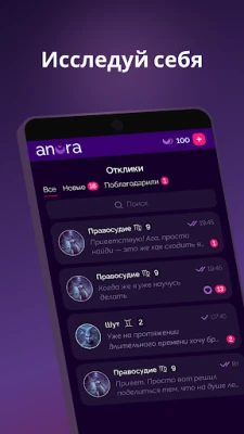 С Anora пред вас се отваря пространство да споделите личните си истории и емоции чрез специално създадена за целта лента. Ще получите не просто отзиви, а сърдечни послания на подкрепа, ценен опит и внимание от други жени, които разбират. Взаимодействието е двупосочно – можете също така да откликвате на чужди разкази, създавайки дълбоки връзки, основани на емпатия и взаимопомощ. Приложението предлага и уникални инструменти, които ще ви помогнат да осмислите своите вътрешни състояния и да изясните чувствата си. Събирайте "Луни" – нашата вътрешна валута, за да отключвате още повече вълнуващи възможности и да получавате персонализирани предложения за въпроси, които задълбочават самопознанието.